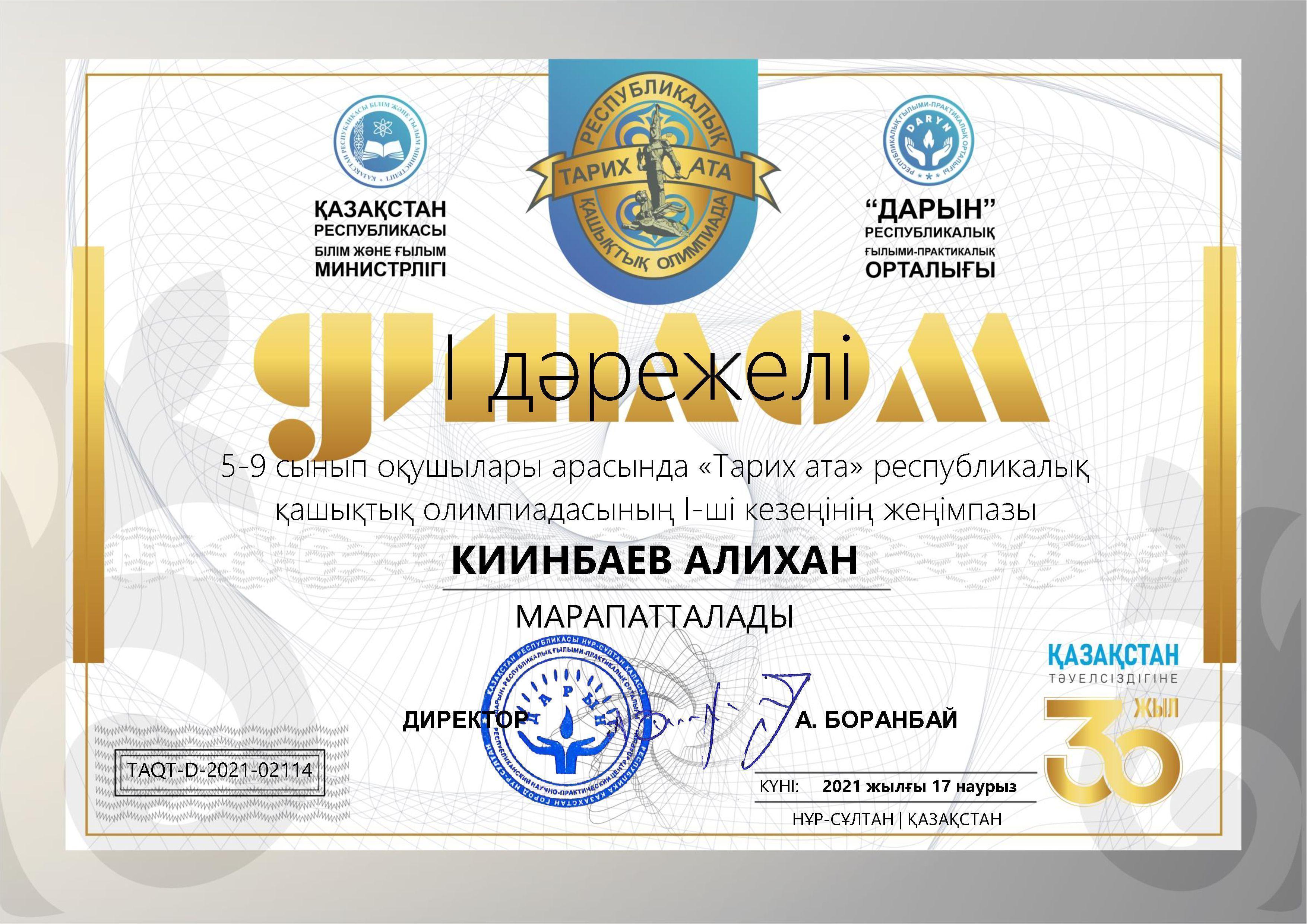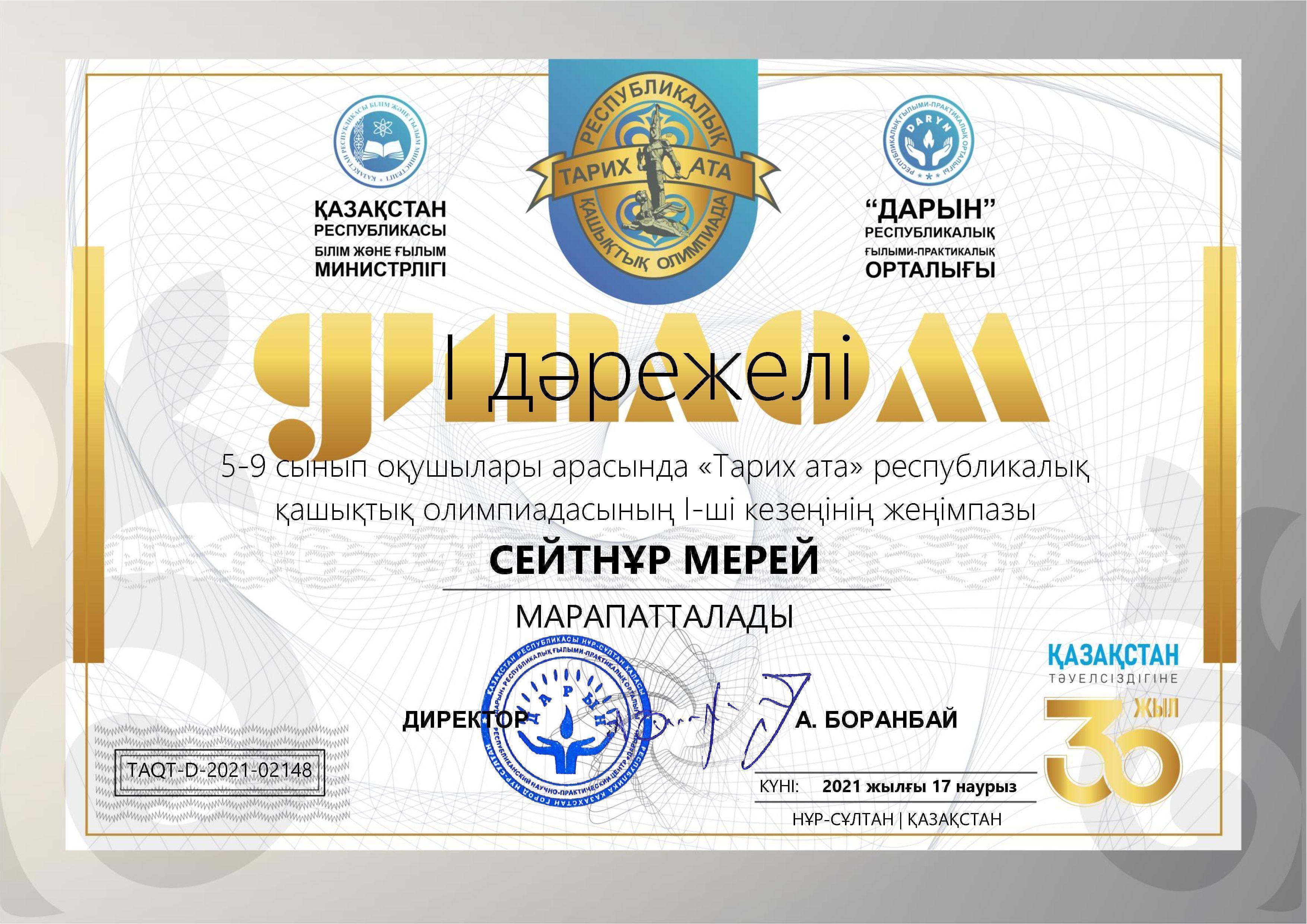 "Тарих ата" республикалық қашықтық олимпиадасының 1 орын жеңімпаздары