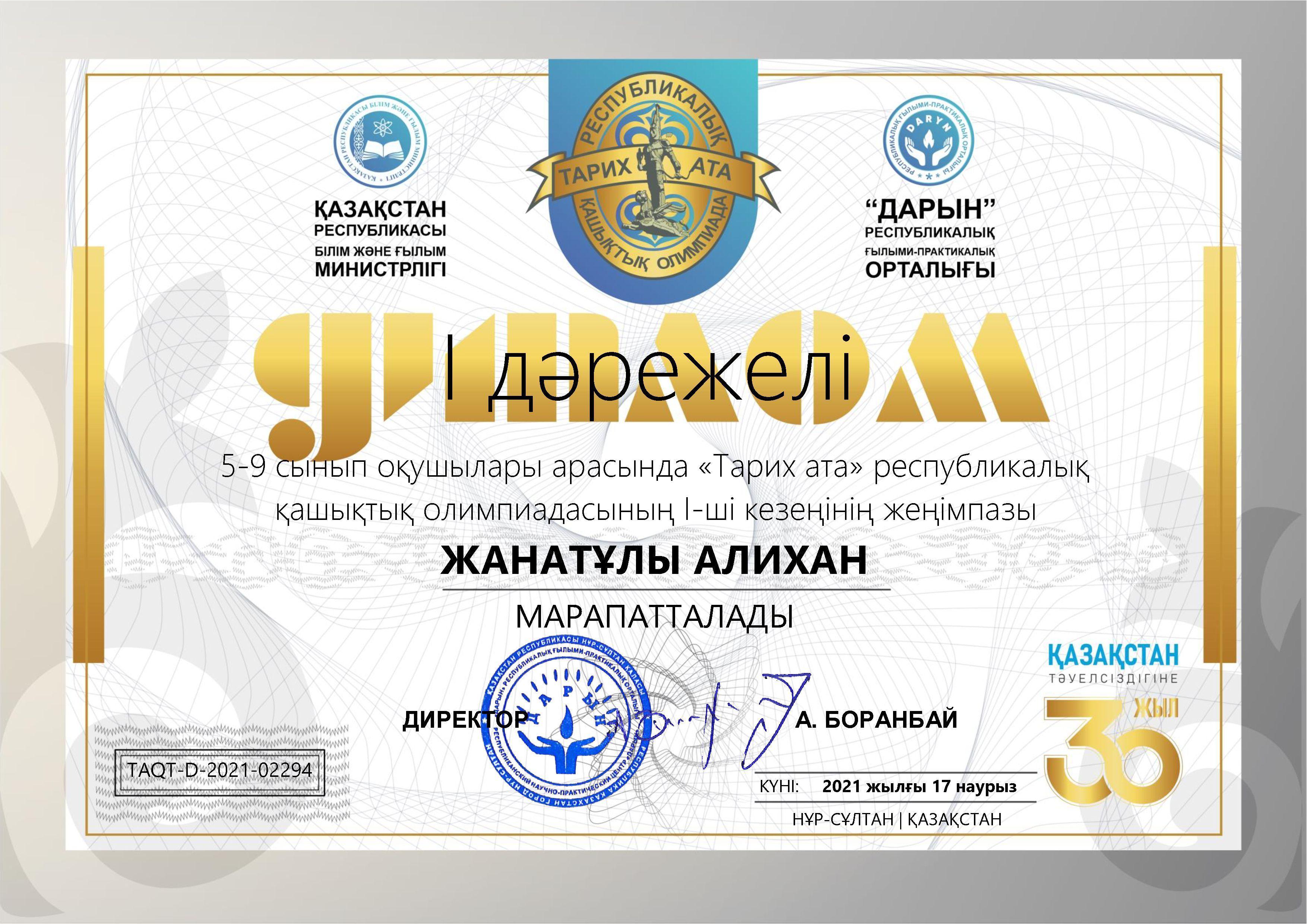 Алматы қаласы Алмалы ауданы №67 жалпы білім беретін мектептің 9сынып оқушылары Ахметов Мейіржан, Сейтнұр Мерей, Муратхан Еркежан және 5сынып оқушылары Жанатұлы Алихан, Киинбаев Алихан "Тарих ата" республикалық қашықтық олимпиадаға қатысып, І дәрежелі Дипломмен марапатталды.