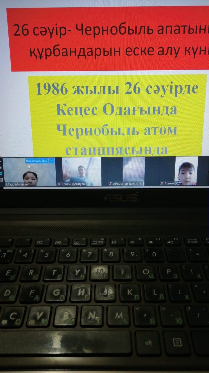 Алмалы ауданы #67 жалпы білім беретін мектептің 5 ә сыныбында "Чернобыль 20 ғасыр дерті " тақырыбында сынып сағаты өтті. Сынып сағатында оқушыларға апаттың салдары туралы таныстырылым жасалып, оқушылар Чернобыль апатының салдары мен зиянын бағалап, талқылау жүргізді. Сынып жетекшісі Абишева Айнур