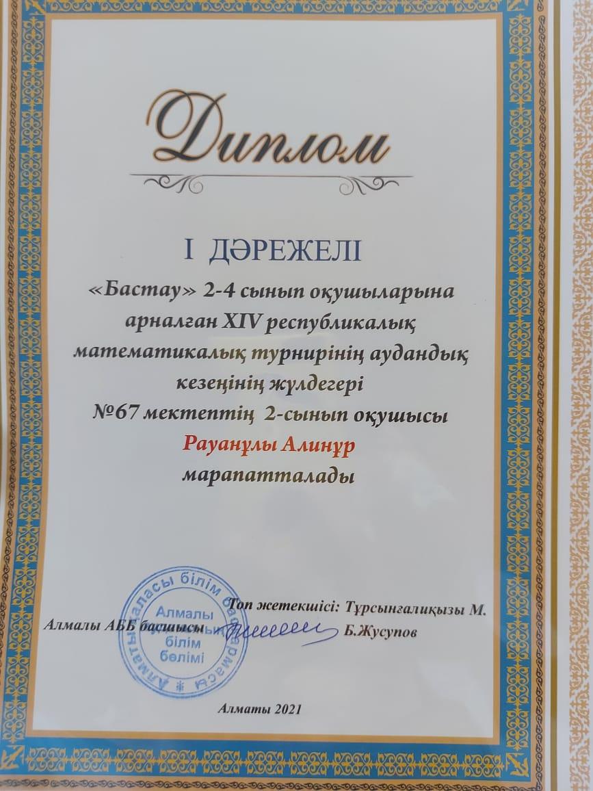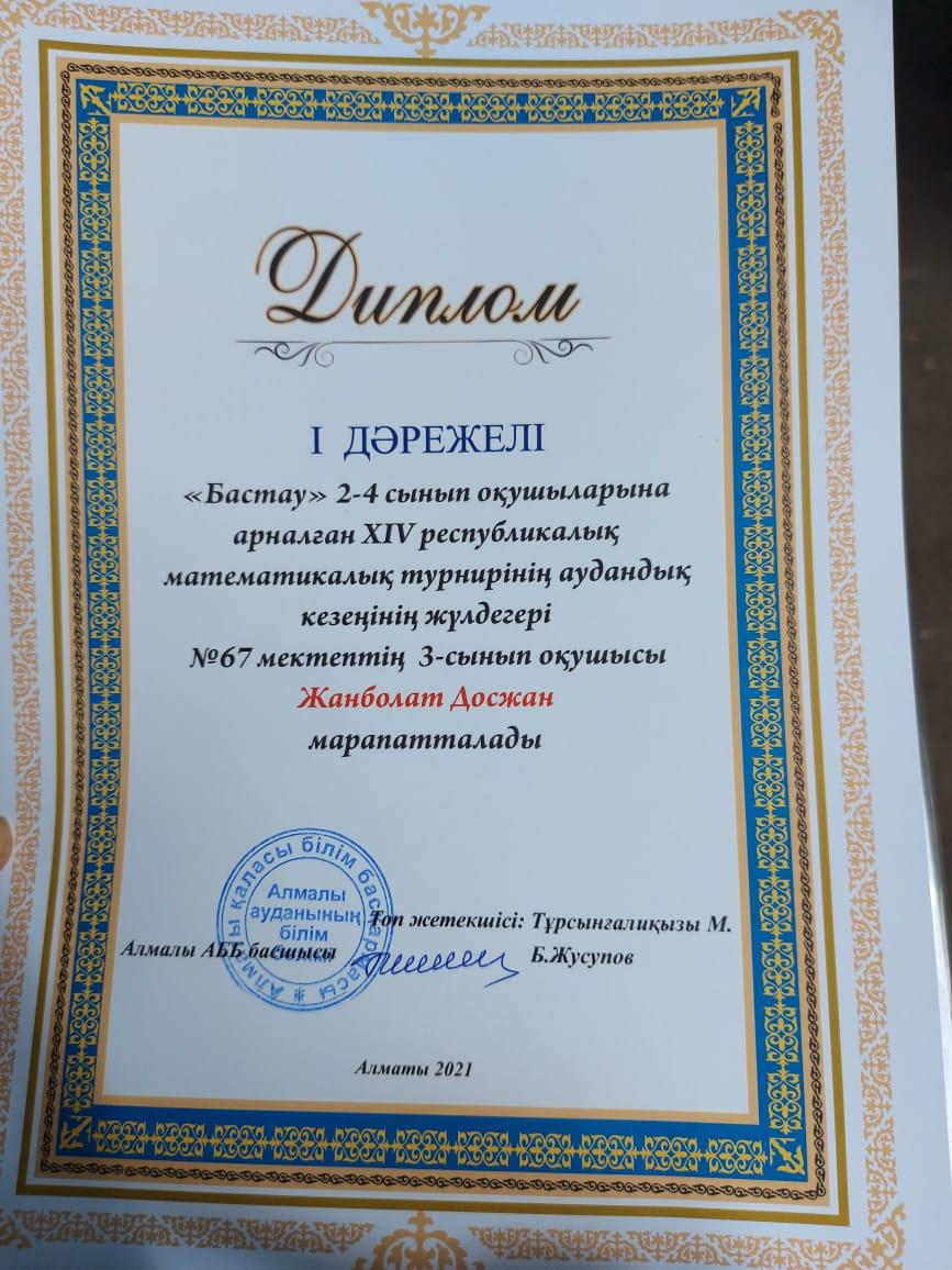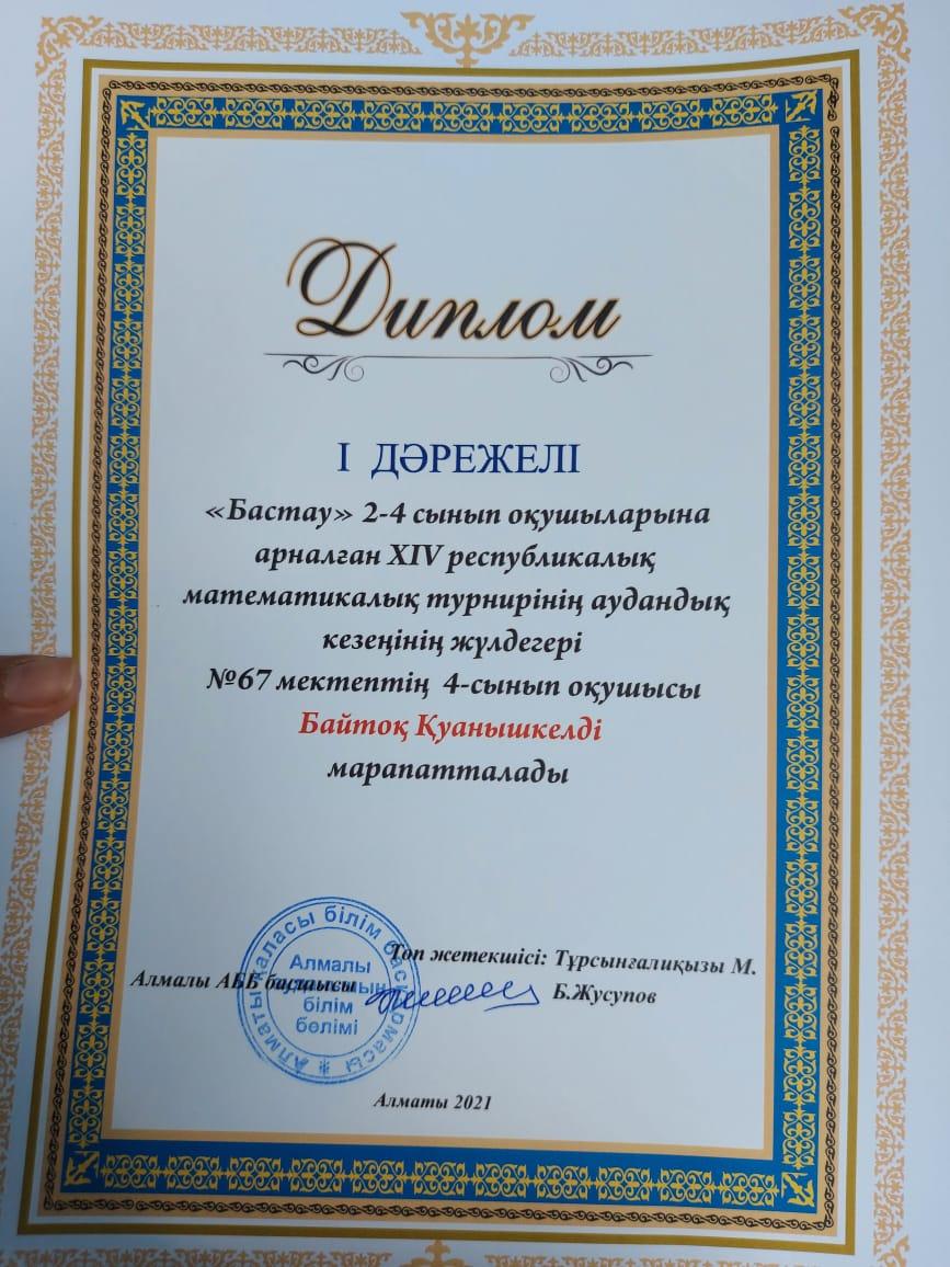 Мамыр айында өткен XIV республикалық 2-4 сыныптар арасындағы математикалық турнирдің аудандық кезеңінде №67 мектептің командасы I орынды жеңіп алып, қалалық кезеңінде III жүлделі орынға ие болды. Шәкіртерімізді және жетекшісі Тұрсынғалиқызы Мөлдірді жеңісімен құттықтап,"Биіктерден көріне беріңіздер!" деп тілек айтамыз. Мектеп ұжымы.