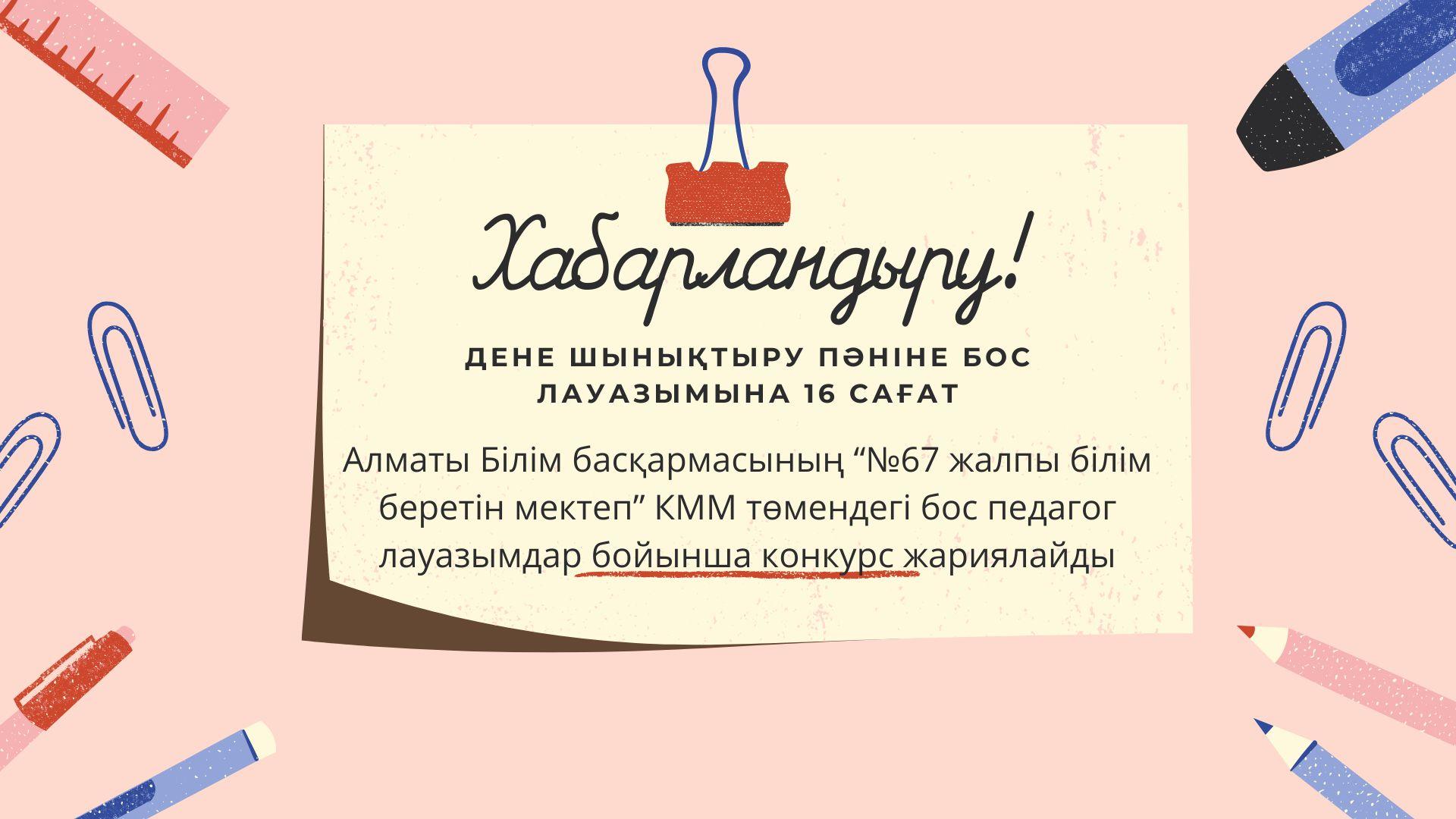 ХАБАРЛАНДЫРУ! №67 ЖББМ 1-СЫНЫП ОҚУШЫЛАРЫН ҚАБЫЛДАУ БАСТАЛДЫ