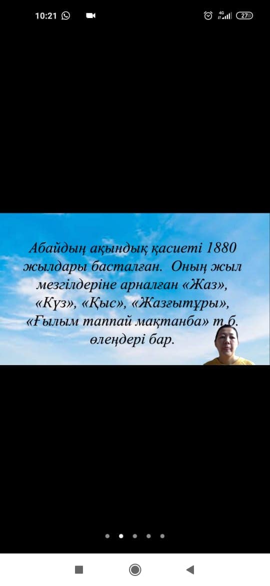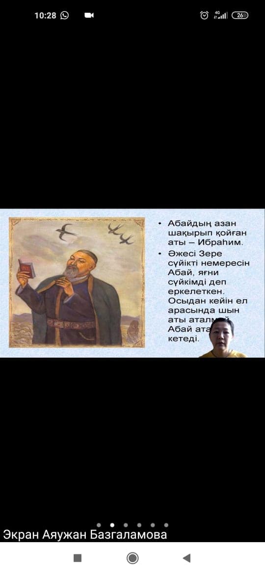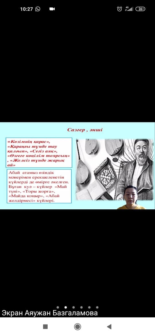 Балалардың жас ерекшеліктеріне сай алынған шара өте тартымды өтті. Балалар Абайдың өлеңдерін жатқа айтып,әндері айтты.Қойылған сұрақтарға толық жауап беріді.Шара қашықтықтан өтуіне қарамастан жоғарғы дәрежеде ұйымдастырылған. Ұстазымыз Аяужанға жас жеткіншектерді тәрбиелеудегі еңбегіне алғыс айта отырып шығармашылық табыстар тілейміз!