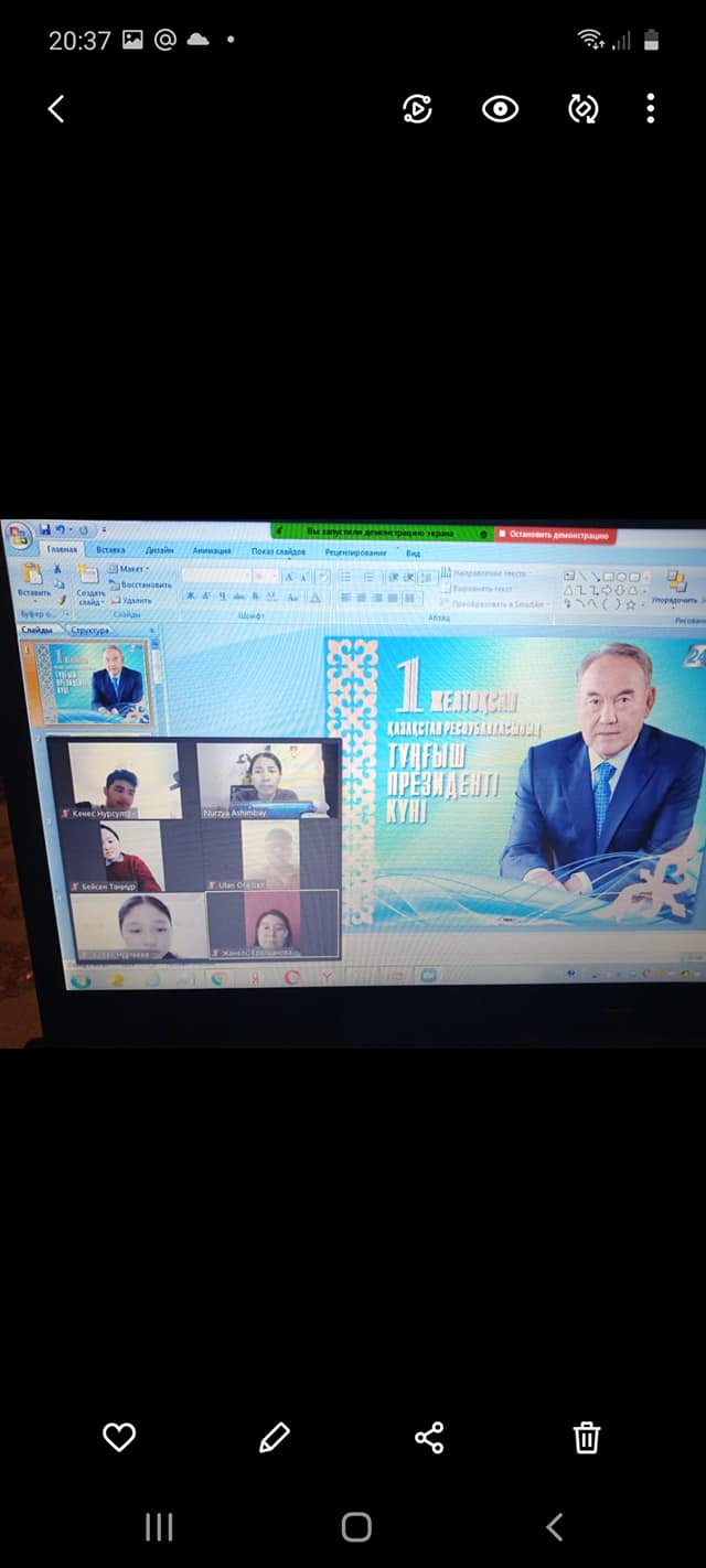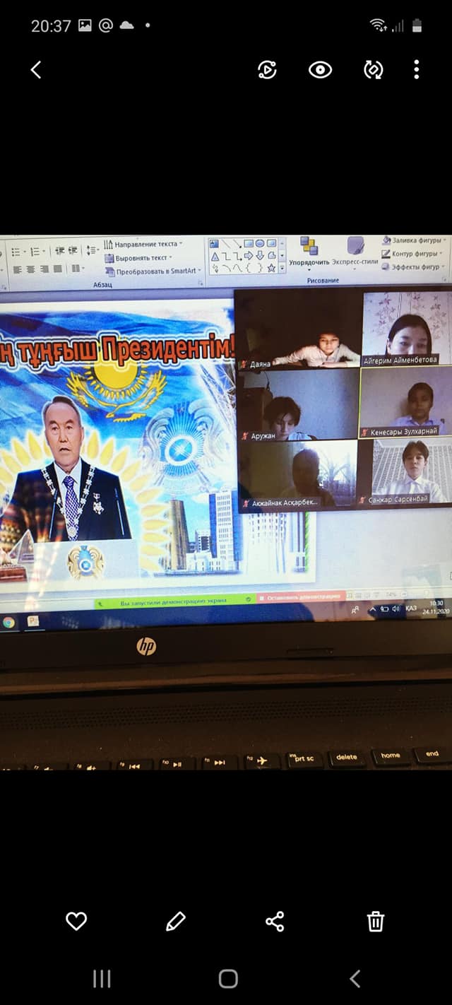 #67 жалпы білім беретін мектепте "1-желтоқсан Тұңғыш Президент күні" мерекесіне орай 1-11 сыныптар арасында "ЕЛІ СҮЙГЕН, ЕЛІН СҮЙГЕН ЕЛБАСЫ" тақырыбында қашықтықтан сынып сағаттары өткізілді.