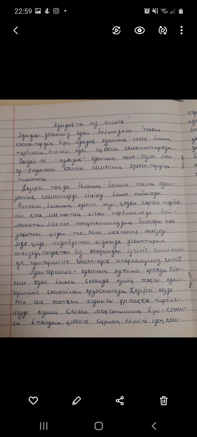 Адалдық-адам мінезіндегі бағалы қасиет. Әрбір қоғамның адалдық жайында өзіндік пайым түсінігі бар. Адалдық адамның жеке басы мен моральдық тұлғасын сипаттайды. Сондай мақсатпен Алматы қаласы Алмалы ауданы #67 жалпы білім беретін мектебімізде Ахмет Байтұрсыновтың "Адамдық диқаншысы" атты апталығымызда 5-10 сыныптар аралығында "Адалдықты ту еттім" атты эссе байқауы өтілді. Әр оқушы адалдық жайлы өз пікірін ортаға салып, пікірлерін ерекше жазған.