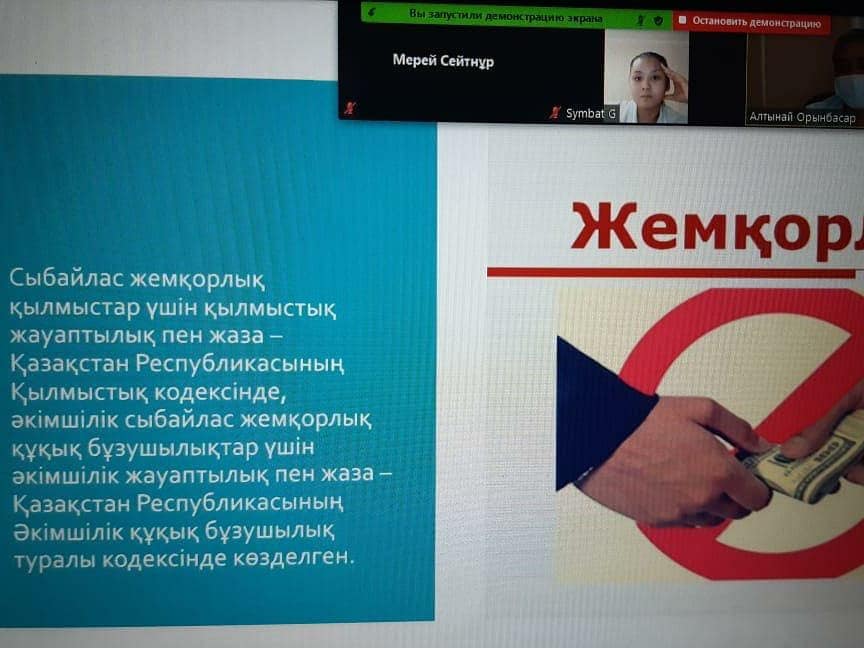 Алматы қаласы Алмалы ауданы #67 жалпы білім беретін мектепте 8-11 сынып оқушылары арасында "Басты кедергі - сыбайлас жемқорлық" атты тақырыппен дебат өткізілді. Пікірталас барысында оқушылар өздерінің ойымен, пікірімен бөлісті. Сонымен қатар оқкшылар, сыбайлас жемқорлықпен күресу барлық Қазақстан Республикасы азаматтарының азаматтық борышы екендігін түсінді.