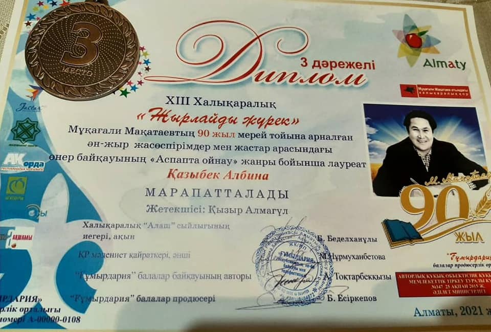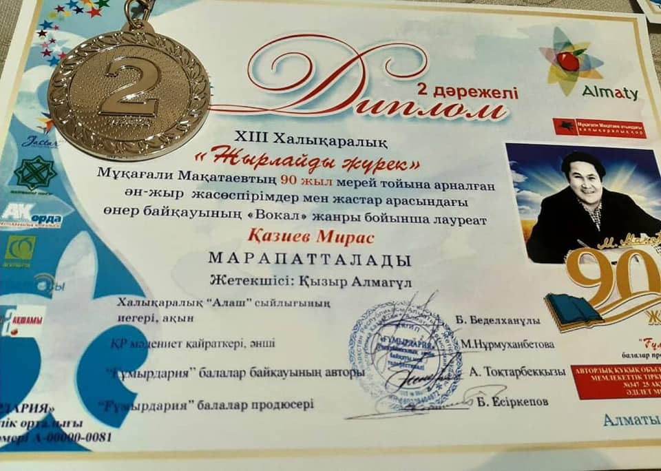 Алматы қаласы Алмалы ауданы #67 жалпы білім беретін мектеп оқушылары ХІІІ Халықаралық "Жырлайды жүрек" Мұқағали Мақатаевтың #90 жыл мерей тойына арналған ән-жыр жасөспірімдер мен жастар арасындағы өнер байқауында "Вокал" жанры бойынша Қазиев Мирас 2 дәрежелі Дипломмен, "Аспапта ойнау" жанры бойынша Қазыбек Альбина 3 дәрежелі Дипломмен марапатталды.