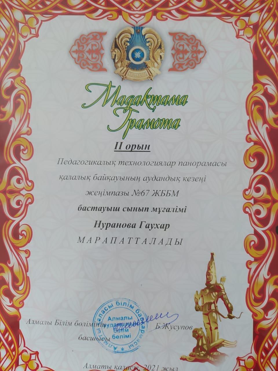 Алматы қаласы Алмалы ауданы #67 жалпы білім беретін мектептің бастауыш сынып мұғалімі Нуранова Гаухар Бағдатқызы "Педагогикалық технологиялар панорамасы" атты қалалық байқаудың аудандық кезеңіне қатысып жүлделі ІІ орынды жеңіп алды.