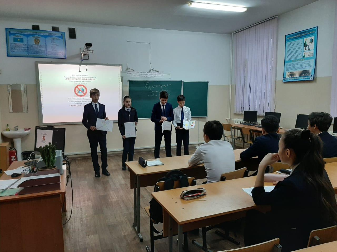 Бүгін 21.01.2020 жылы №67 жалпы білім беретін мектепте Бүкіләлемдік интернетсіз күн науқаны аясында "Мен offline" тақырыбында 1-11 сыныптар арасында сынып сағаты өткізілді. "Интернеттің пайдасы мен зияны", "Қауіпсіз интернет" жайлы айтылып, постерлер қорғалды.
