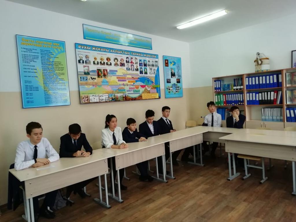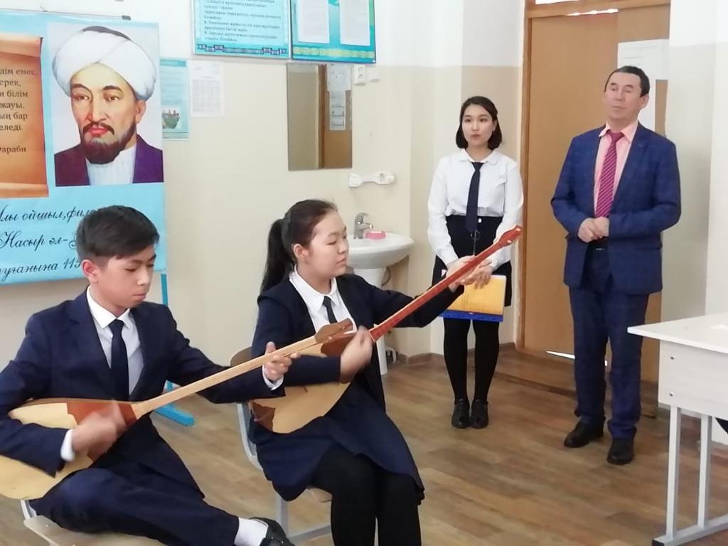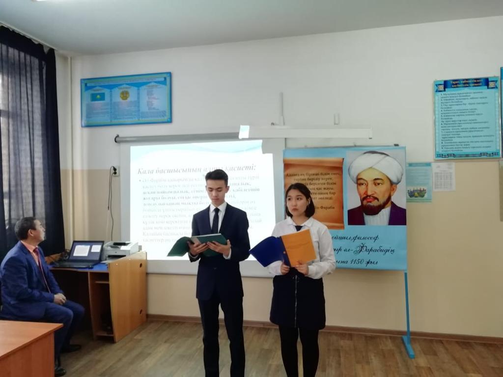 12 ақпанда Əл-Фарабидің 1150 жылдығына орай 9 "А" сыныбында ұлы ғалымның "Қайырымды қала тұрғындарының көзқарастары туралы трактаттар" еңбегі негізінде дөңгелек столды тарих пəнінің мұғалімі Тарақов Хамит өткізді. Оқушылар еңбекті талқылады, өлеңдерін мəнерлеп оқыды, күй тартты. Ұлы даланың кемеңгер тұлғасының өмірі мен шығармашылығына оқушылардың қызығушылықтары артты. Алғысымыз шексіз!