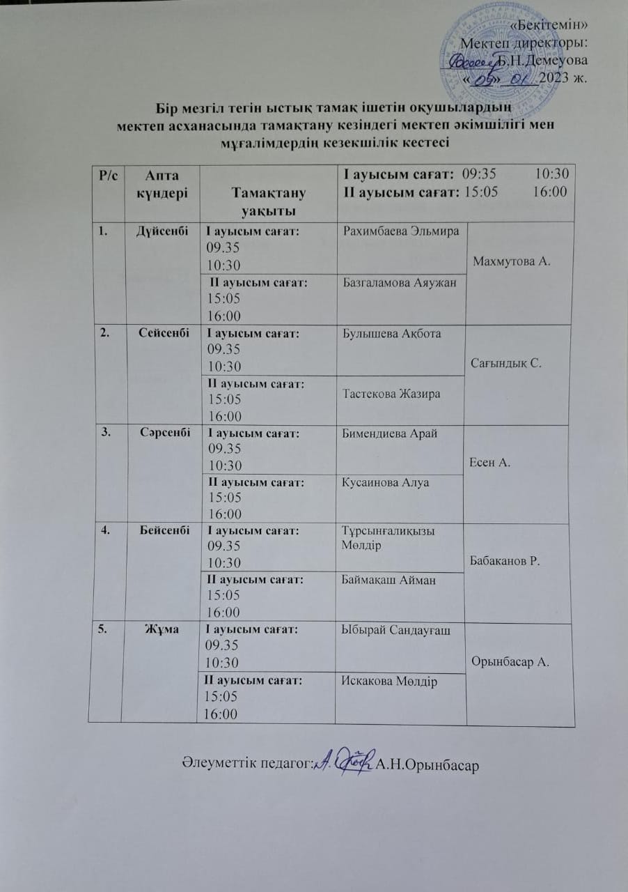 09 қаңтар 2023 0 1 2 3 4 5 Мектеп асханасында оқушылардың тамақтану кезіндегі мектеп әкімшілігі мен мұғалімдердің кезекшілік кестесі 2023ж. Осы беттің QR-коды:QR-код этой страницы: